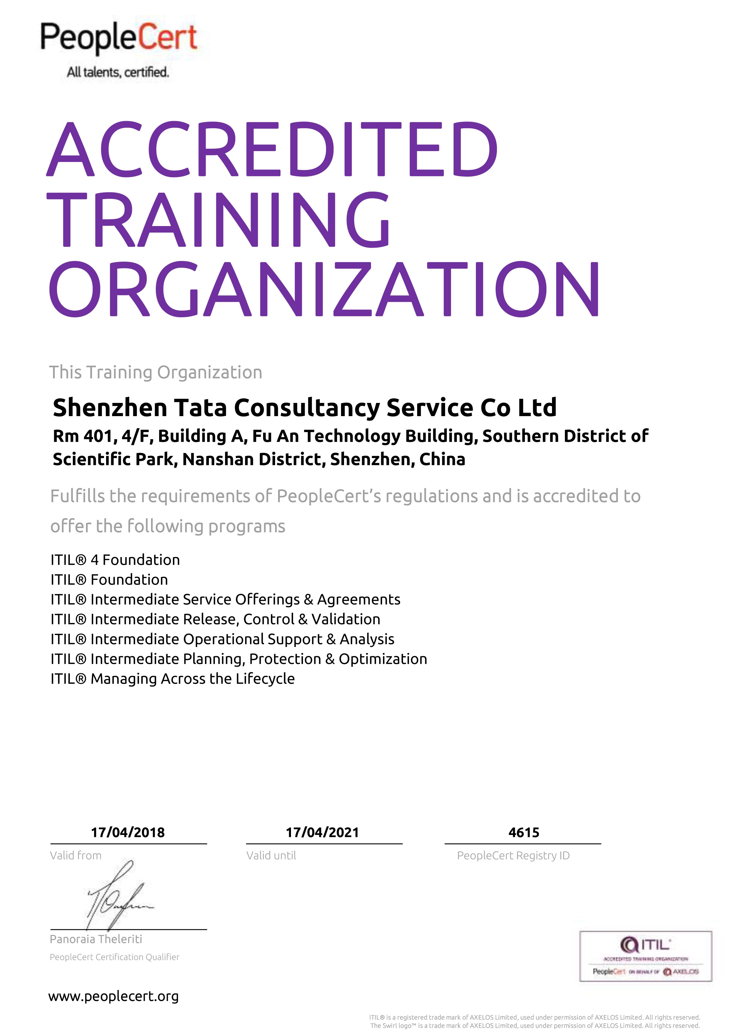 PeopleCert是一家總部坐落于希臘雅典的國(guó)際認(rèn)證機(jī)構(gòu),迄今為止PeopleCert已經(jīng)在全球范圍內(nèi)培訓(xùn)了500多萬(wàn)學(xué)員,頒發(fā)了一百多萬(wàn)張證書(shū),設(shè)立了1萬(wàn)多家考試中心。PeopleCert除了作為AXELOS認(rèn)證產(chǎn)品的官方認(rèn)證機(jī)構(gòu)以外,其認(rèn)證業(yè)務(wù)還覆蓋了精益六西格瑪、Cobit 5.0、DevOps等。
