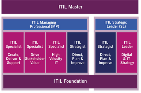 4認(rèn)證體系包含了五個(gè)模塊,分別為基礎(chǔ)模塊,專家模塊(三門課程),戰(zhàn)略師模塊,領(lǐng)導(dǎo)者模塊和大師模塊。兩條通往ITIL