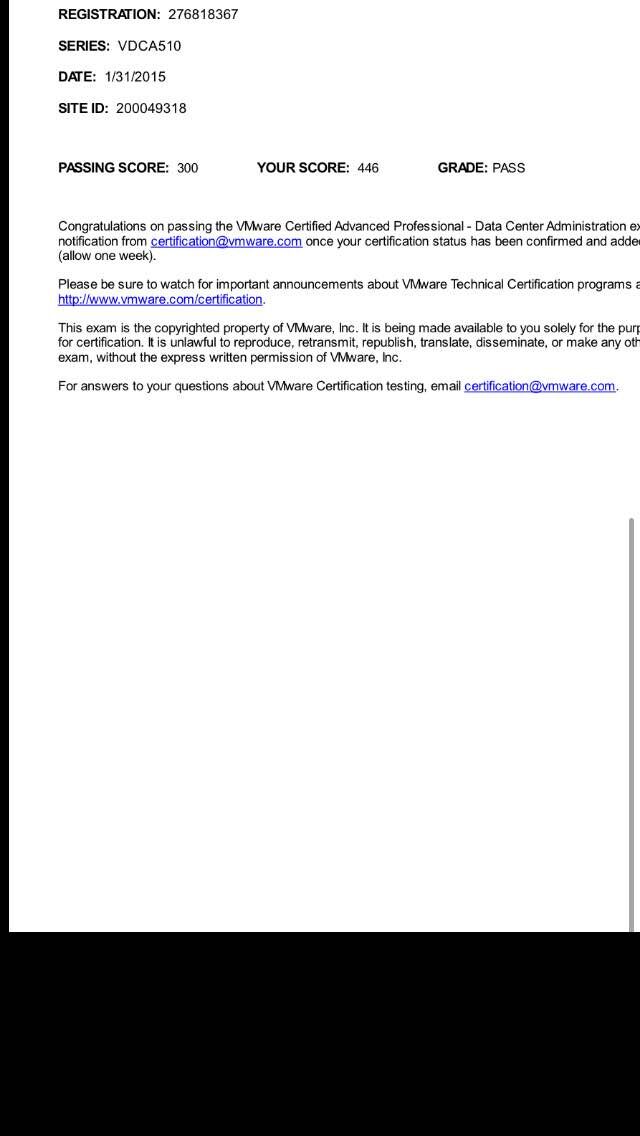 在備考VCAP的這段時(shí)間里認(rèn)識(shí)了同樣在備考的兩個(gè)北京的哥們,一起討論知識(shí)點(diǎn),一起做練習(xí)題,一起到vmksy看別人的考試心得。到了12月初的時(shí)候就選了廣州考場(chǎng)1月4號(hào)的位置,然后利用最后三周的時(shí)間沖刺。在此期間這2個(gè)北京的哥們都比我先參加考試,他們出乎意料的都掛了,其中一個(gè)哥們還是第二次考,搞的我當(dāng)時(shí)非常緊張。1月4號(hào)考試如期參加,4個(gè)小時(shí)的考試時(shí)間非常緊張,在考試中遇到了幾個(gè)troubleshoot題目一直沒有找到問題點(diǎn)浪費(fèi)了很多時(shí)間,但是考試完后自我感覺還不錯(cuò)。覺得應(yīng)該可以過,一個(gè)小時(shí)后我收到了VMWare的成績(jī)單 285,當(dāng)時(shí)心情非常失落,覺得這三個(gè)月的努力都白費(fèi)了。并且Vmware在12月已經(jīng)放出公告將在1月31號(hào)停止vcap510的考試,導(dǎo)致所有位置都被預(yù)約完了,連續(xù)刷了兩天都沒有位置,想再次考試只能參加vcap550 。
