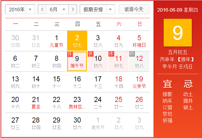 2016年6月9日放假安排時(shí)間表:2016年6月9日至2016年6月11日放假三天。6月12日正常上班!
