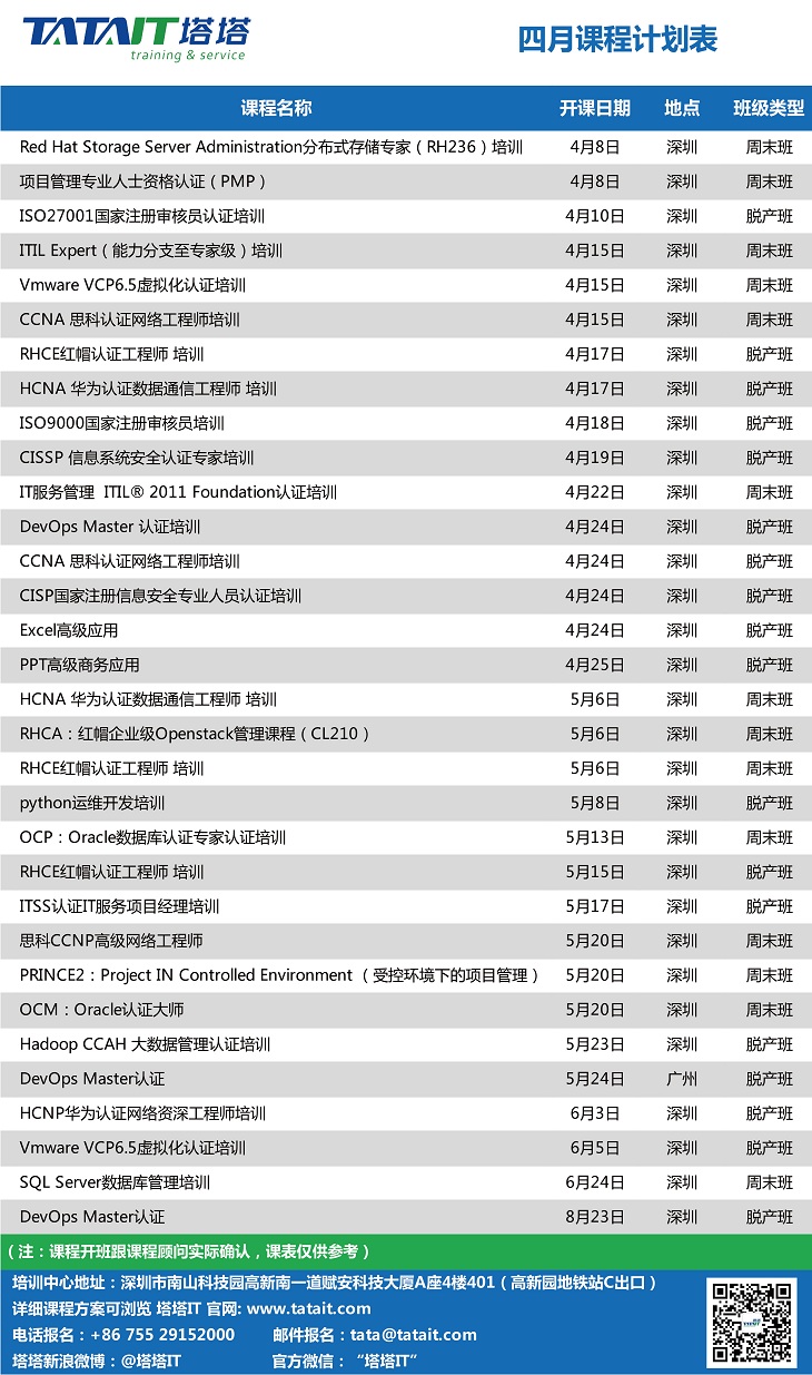 課程安排:4月1日-2日(OCP,RHCE,CCNP)停課一周,課程順延至4月8日-9日,詳情請(qǐng)關(guān)注開(kāi)課通知。