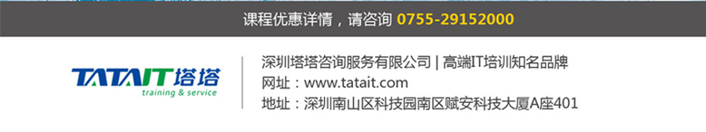 咨詢郵箱:tata@tatait.com 咨詢電話:0755-29152000 新浪微博:@塔塔IT 微信:添加公眾賬號“塔塔IT”加關注!塔塔IT為邁瑞思旗下子品牌,專注高端IT培訓。